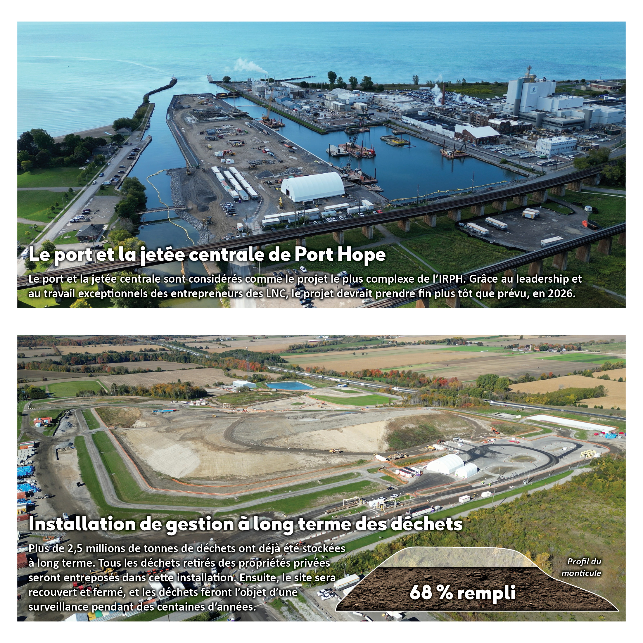 Les travaux sur les sites les plus vastes et les plus complexes de l’IRPH, à savoir le port et la jetée centrale de Port Hope, sont en voie d’achèvement. Le nettoyage du port est terminé et la restauration est déjà en cours. En outre, plus de 2,5 millions de tonnes de déchets ont déjà été stockées en toute sécurité dans l’installation de gestion à long terme des déchets de Port Hope.