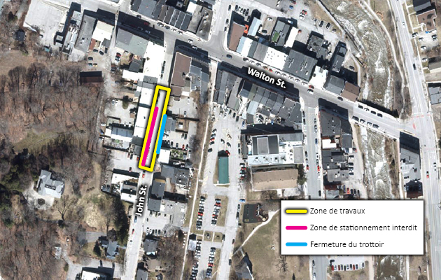 Une partie du trottoir du côté est de la rue John sera également fermée et il n’y aura pas de stationnement dans les environs immédiats.